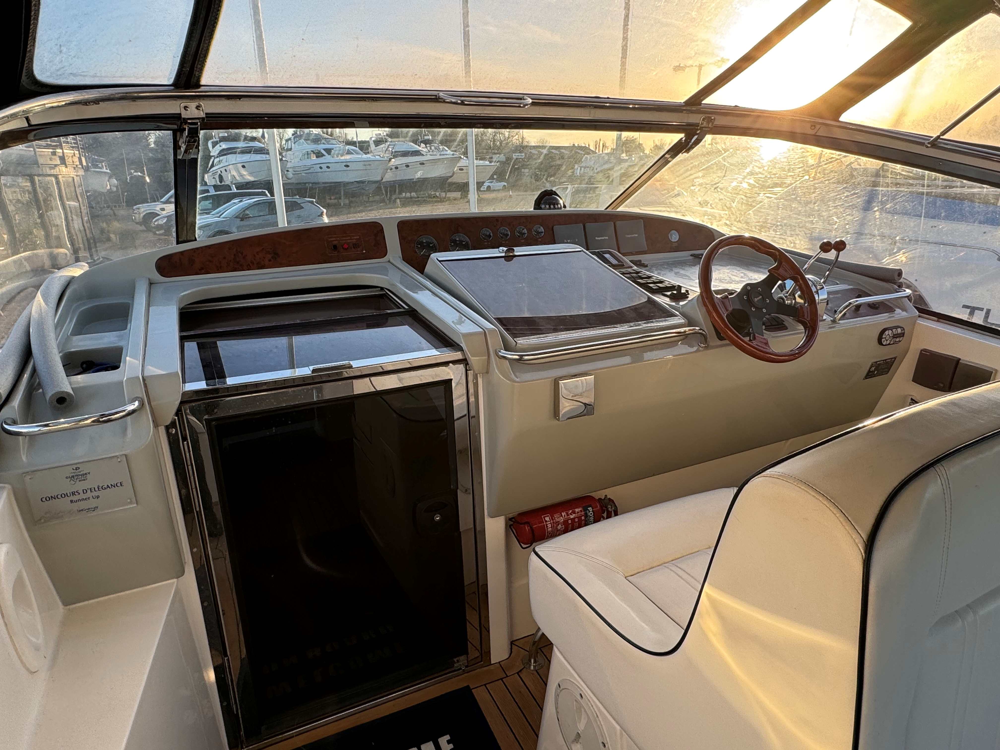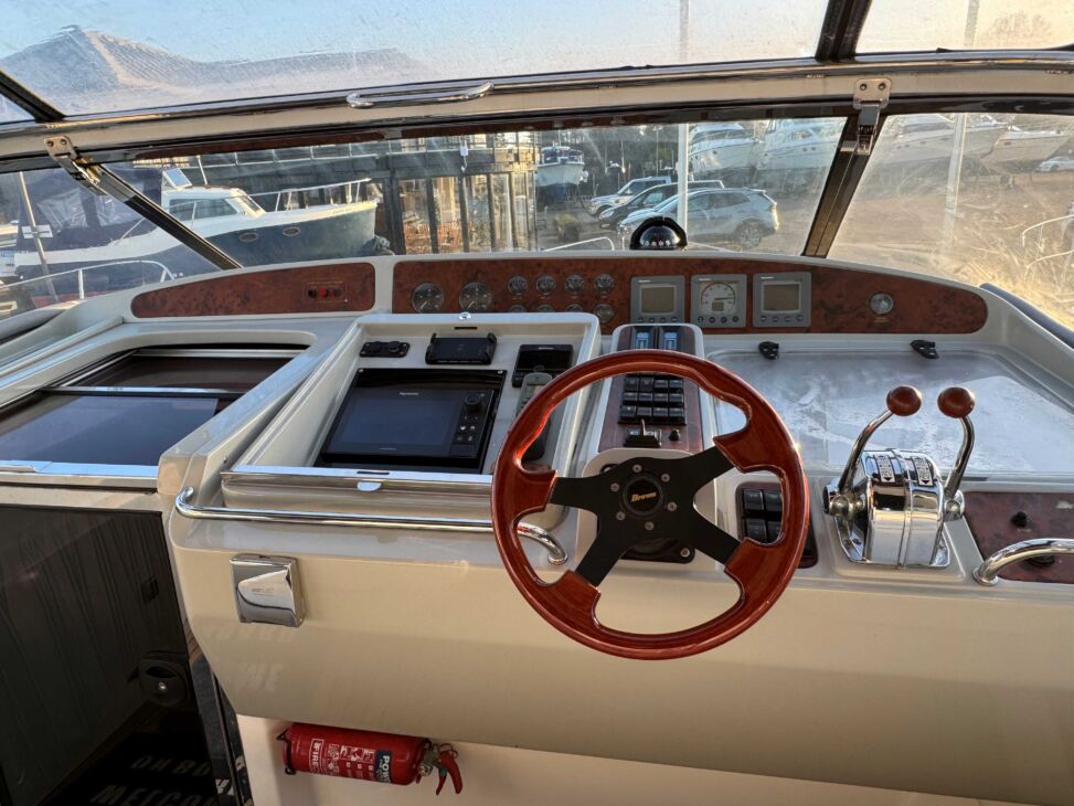The helm position is high enough for great visibility and the console design enables ease of monitoring the navigation equipment and engine systems. The large screen together with the aft canopy ensure a protected area in adverse weather conditions.