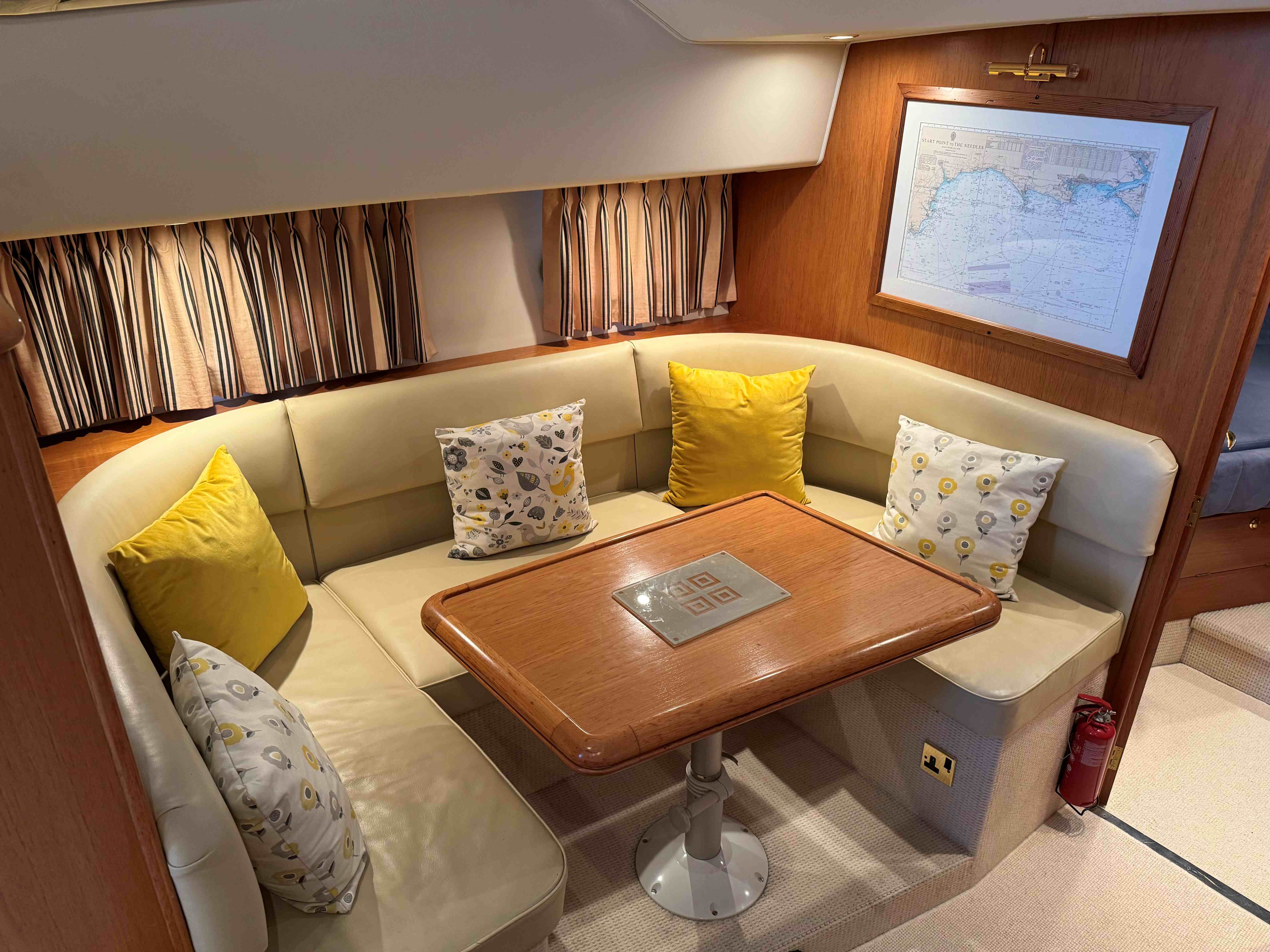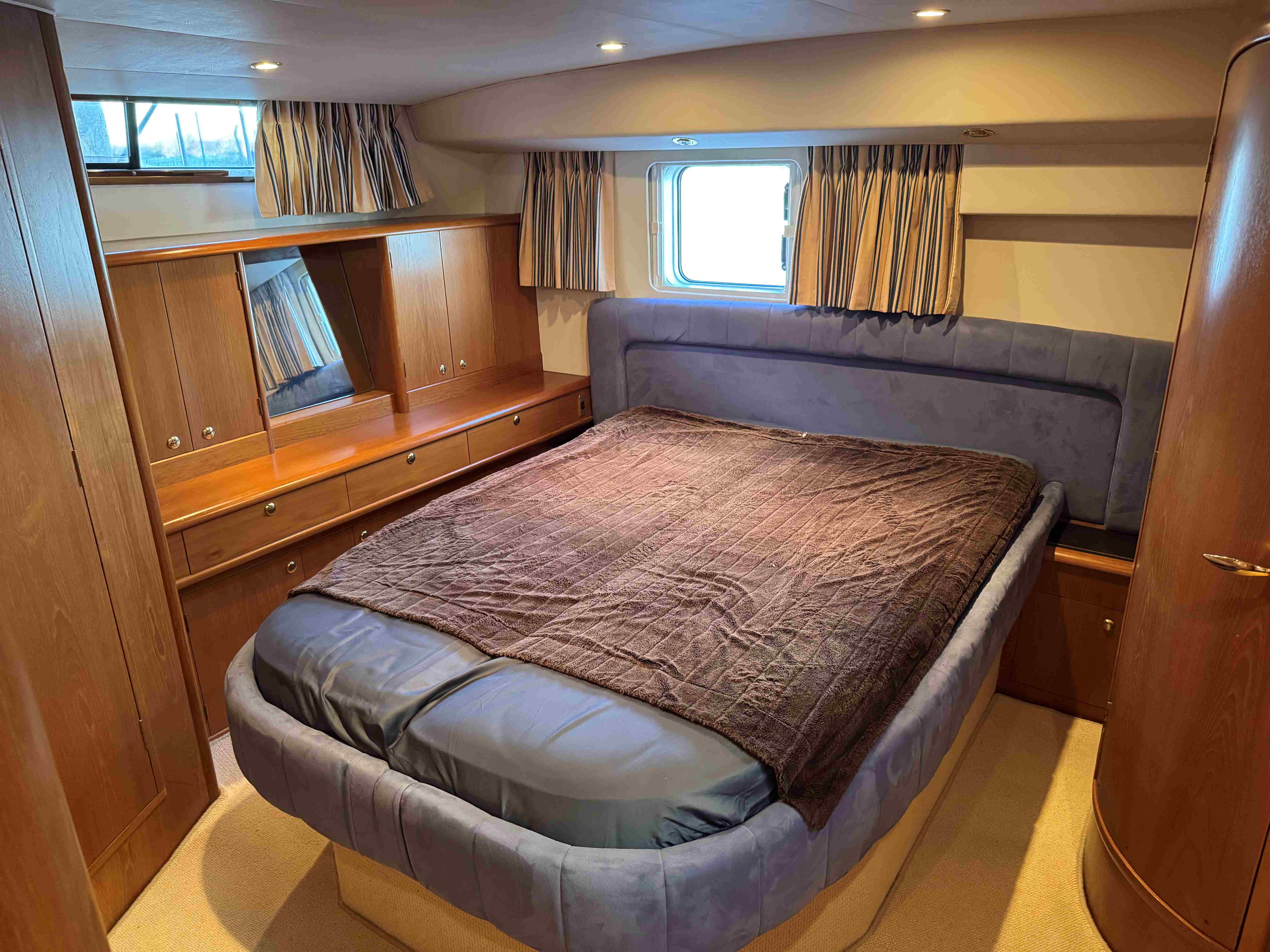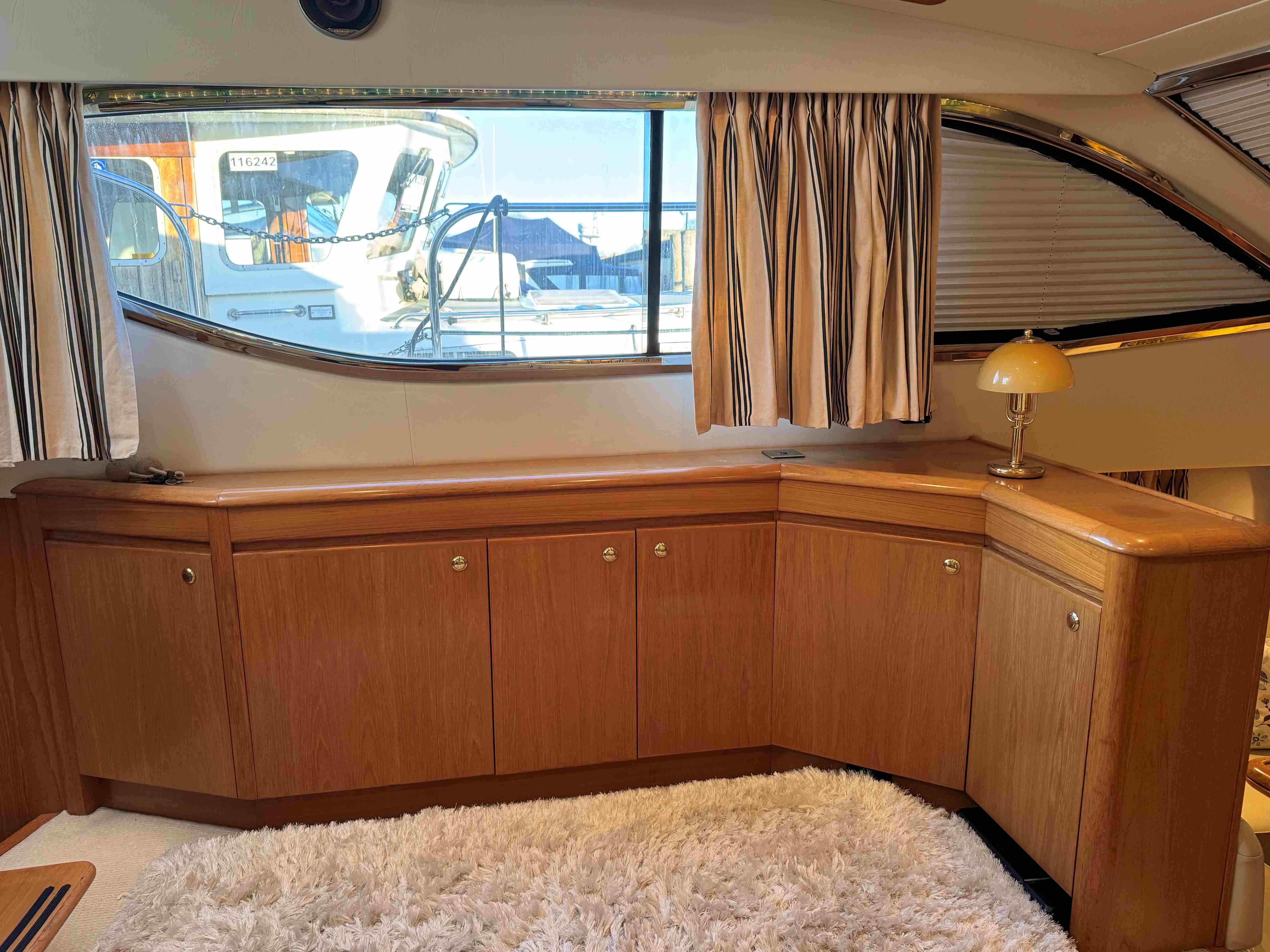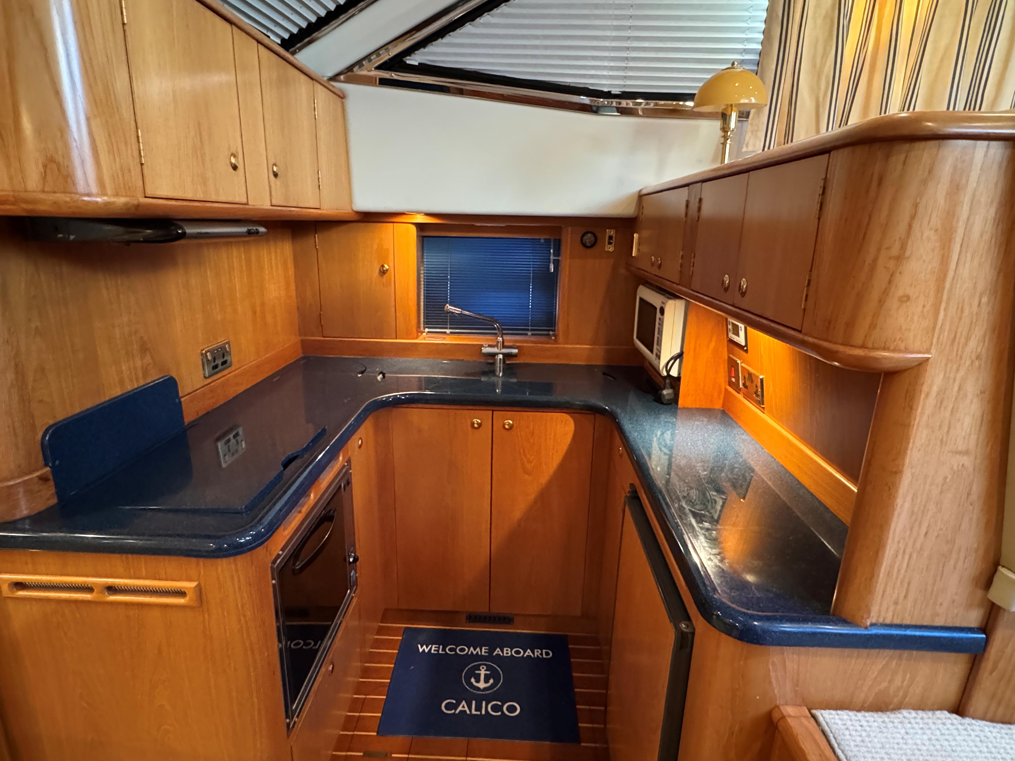 Internally Calico is in excellent condition with teak finish woodwork, cream carpets, leather upholstery and curtains or blinds throughout. The spacious accommodation provides two private cabins, ensuite facilities to both and a large living space with lounge, dining area and galley.