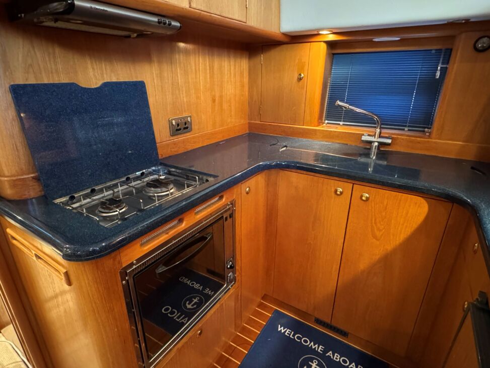 A spacious cabin with full headroom, a large “island” bed and plenty of storage for extended cruising. The transom window creates a very light and stylish cabin.