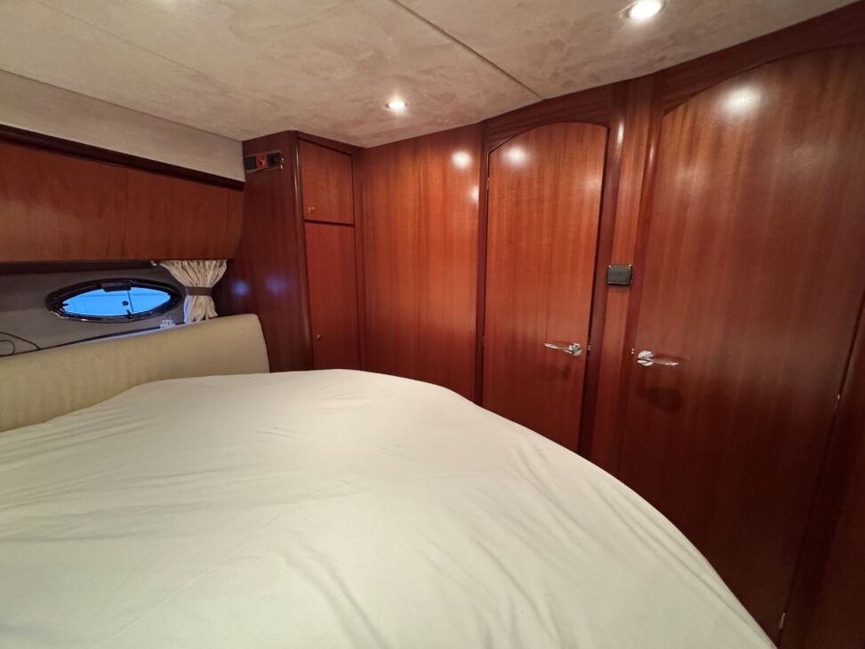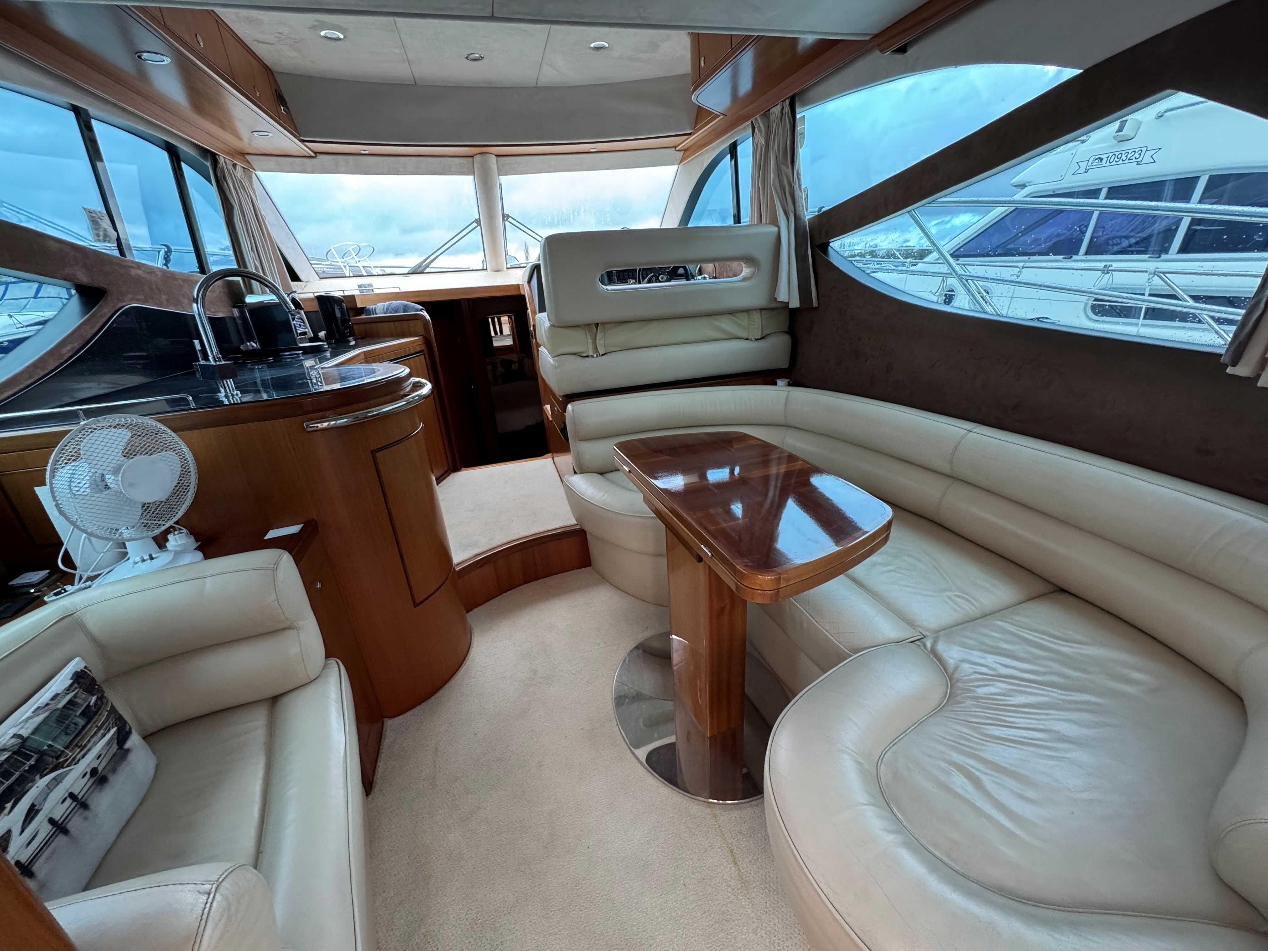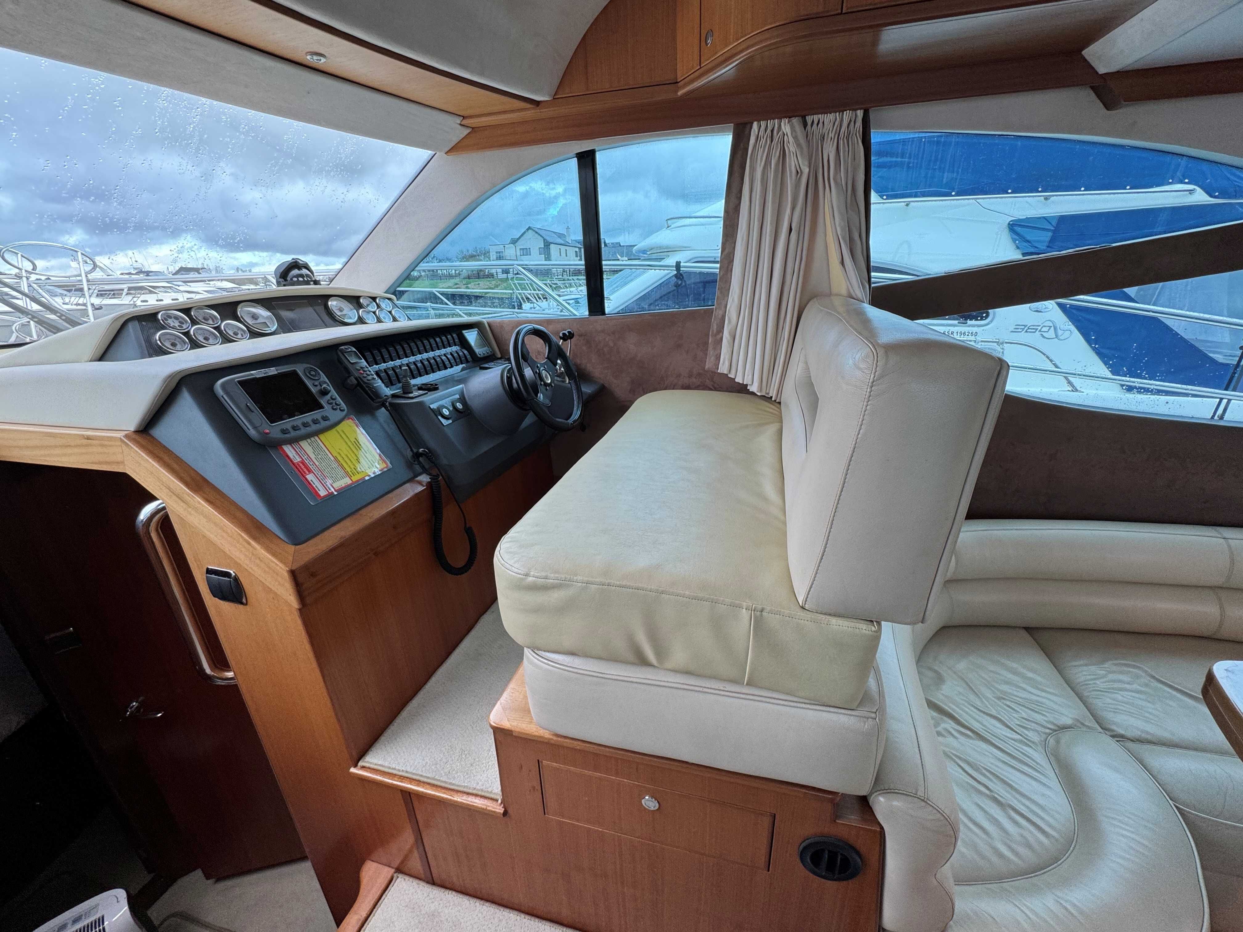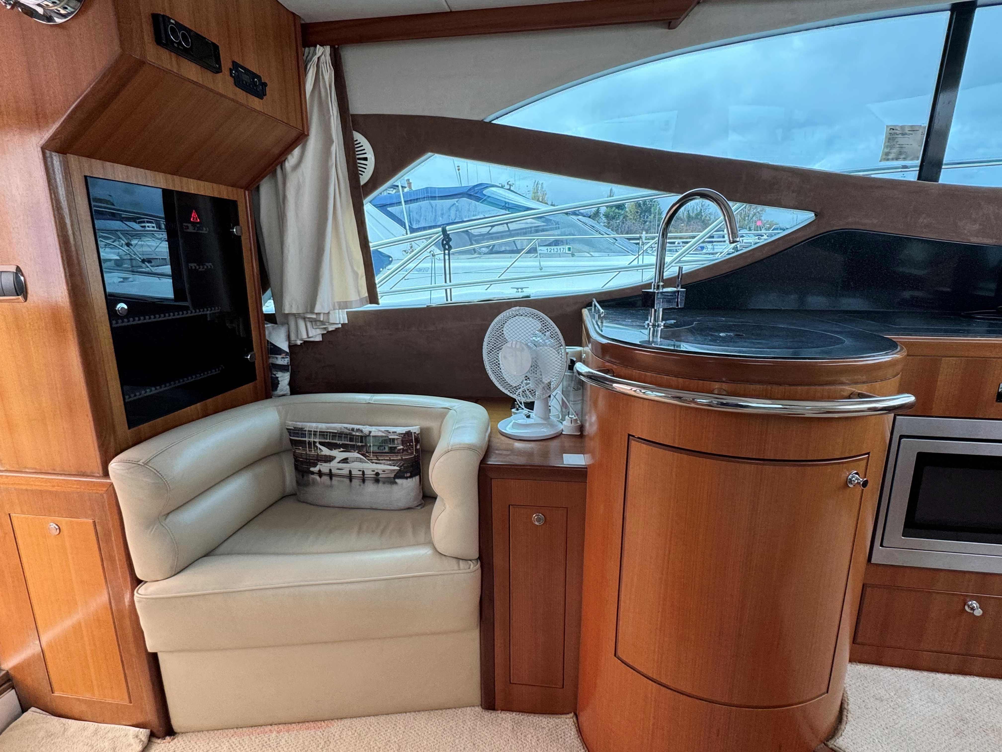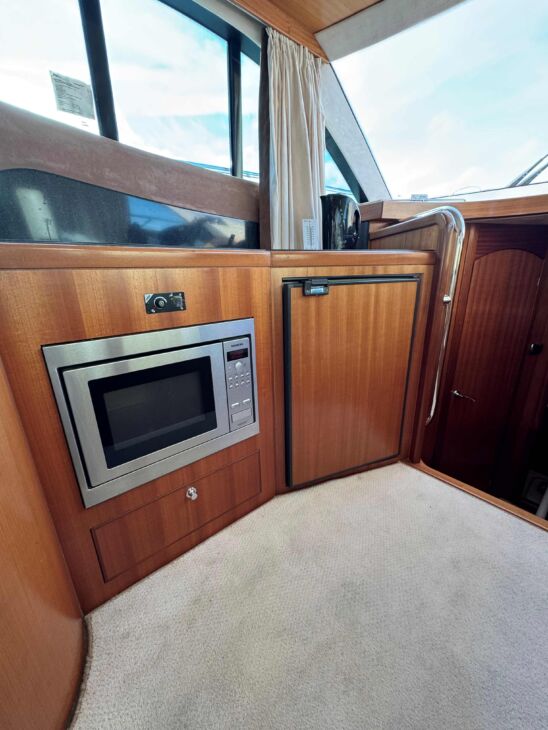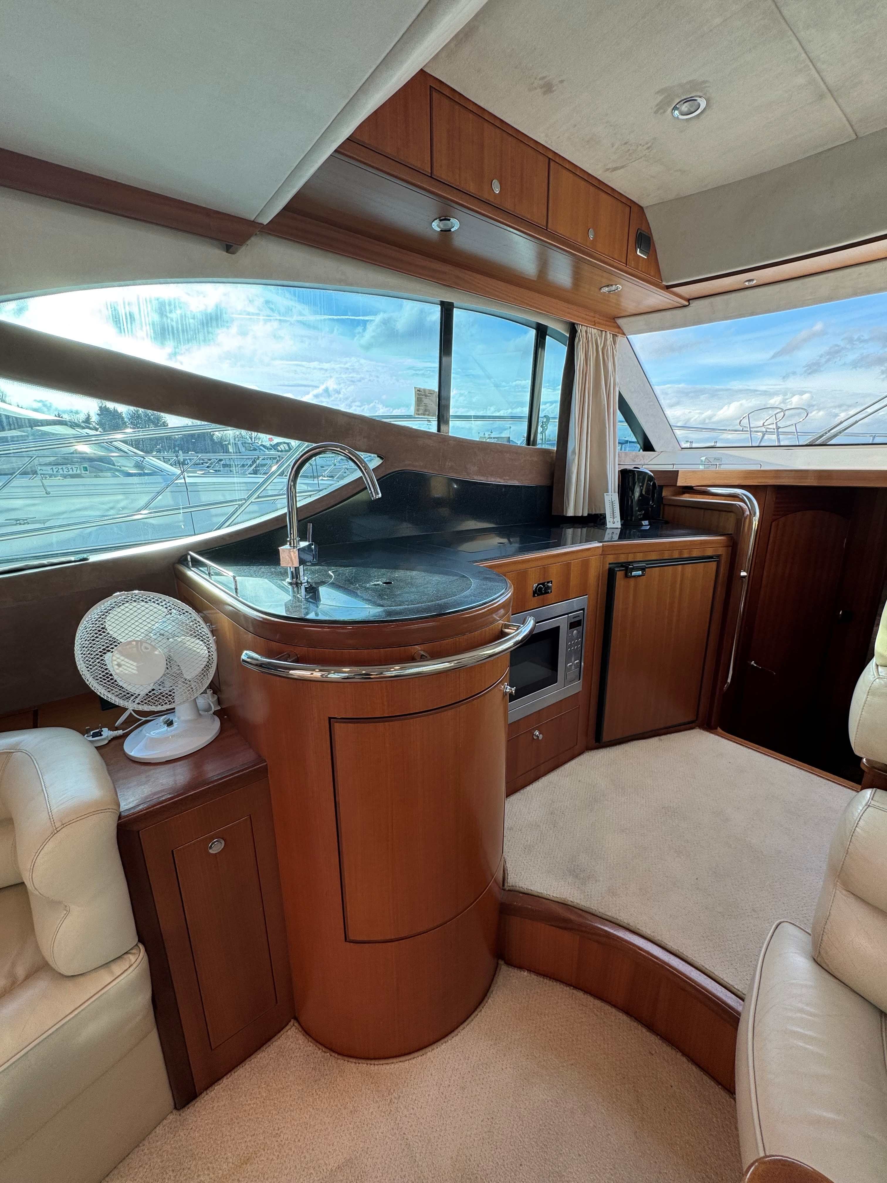 The interior has a luxurious feel with the hi-gloss mahogany woodwork, alcantara panelling, stainless steel work, cream carpets and curtains. This is designed with the “Galley-Up” layout, allowing for the third cabin, giving a single berth or further storage for extra kit.