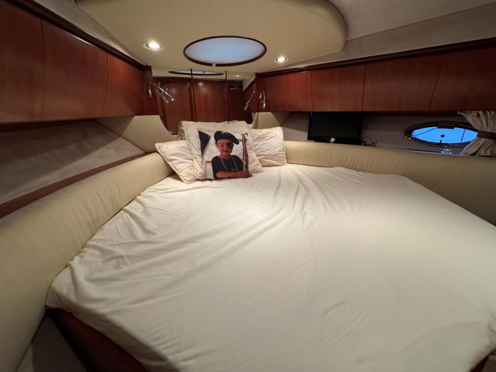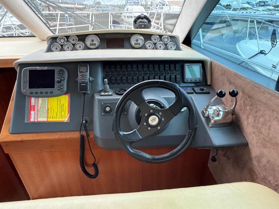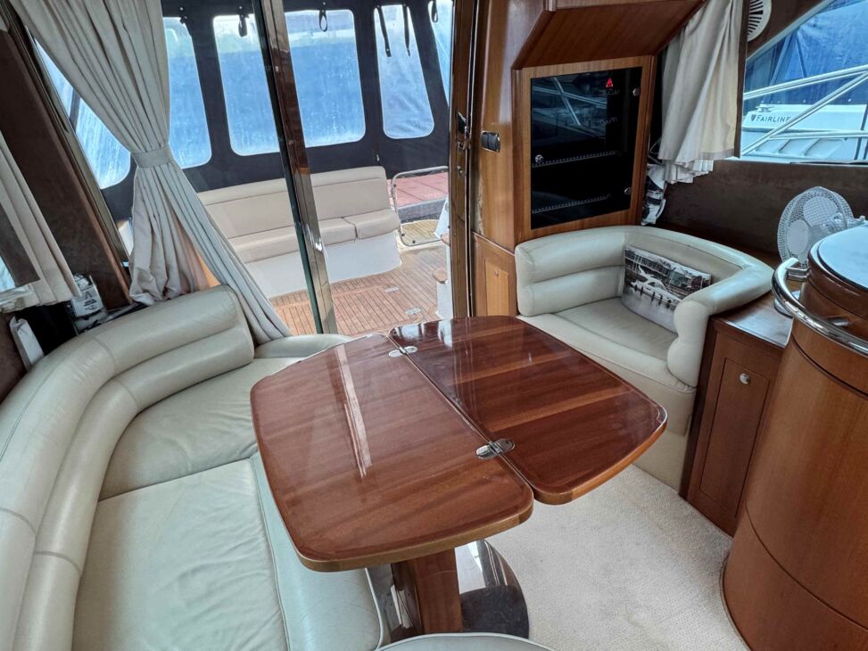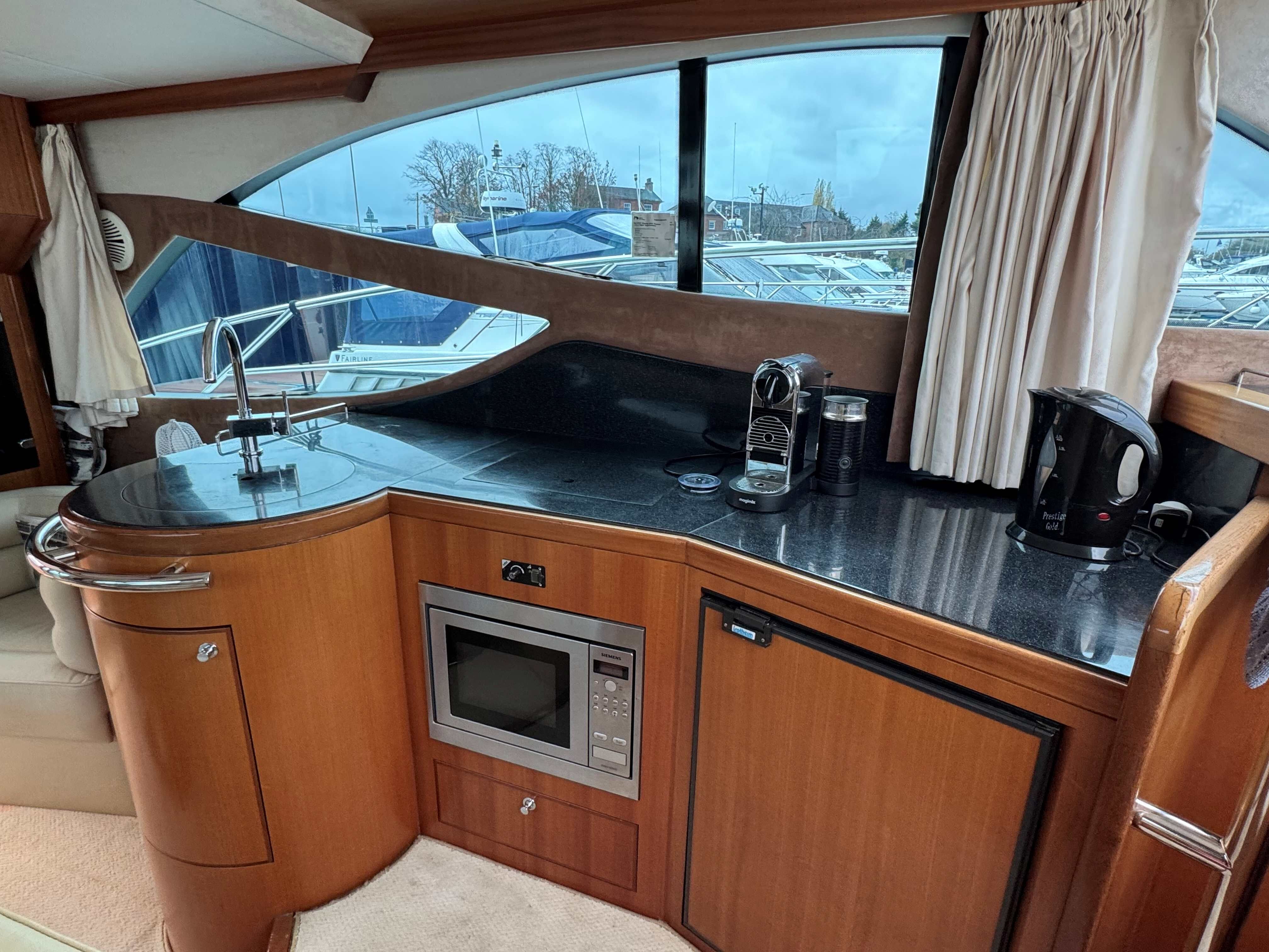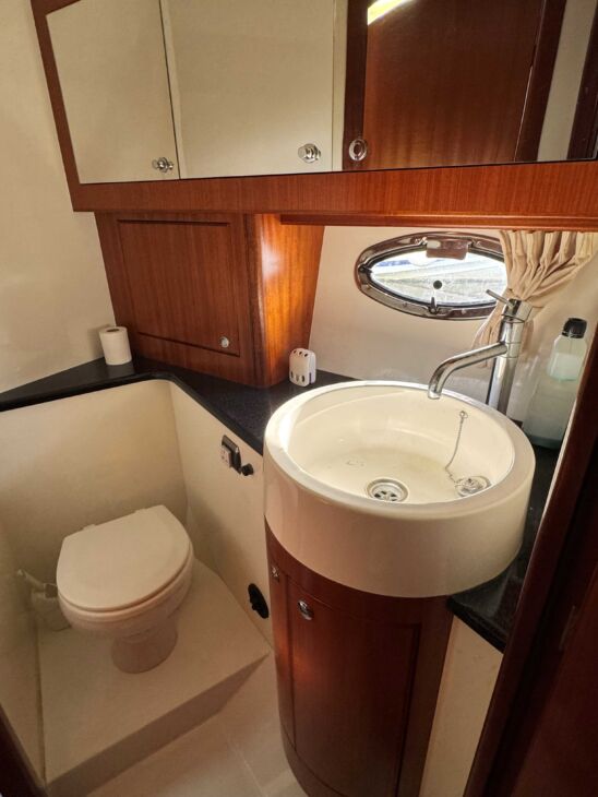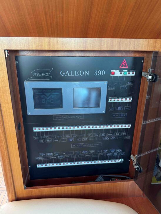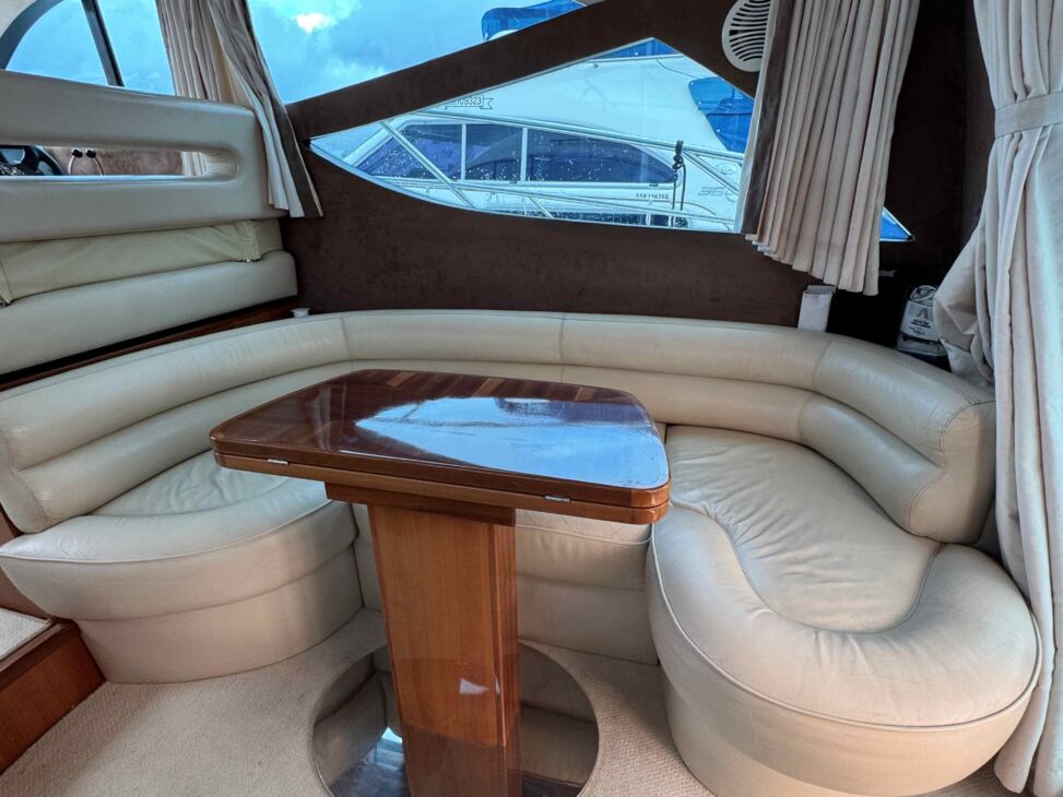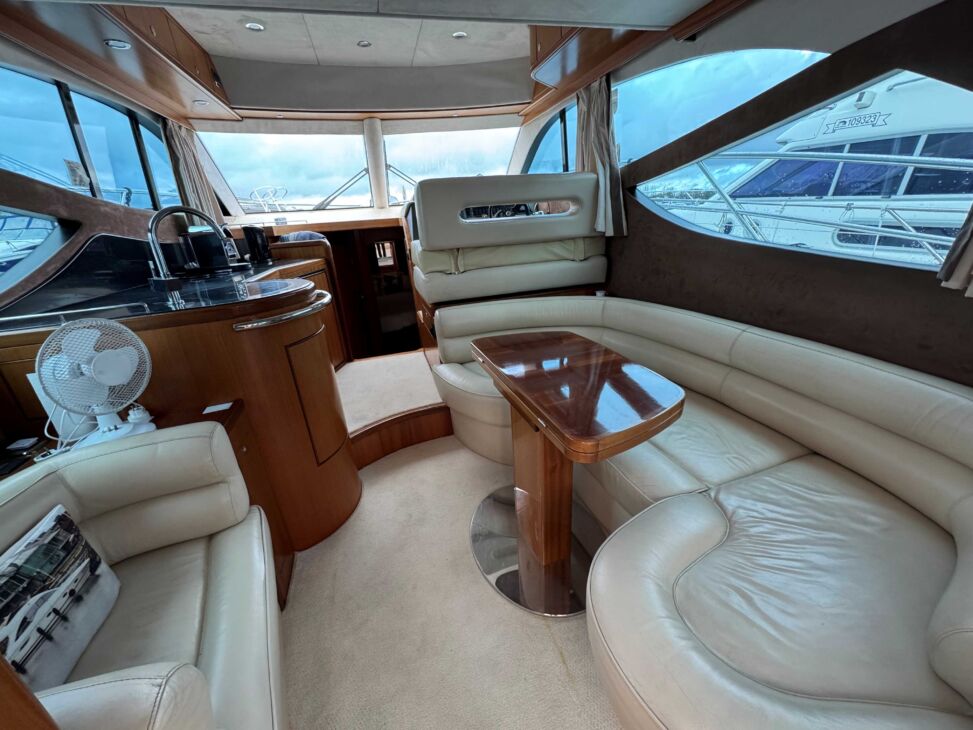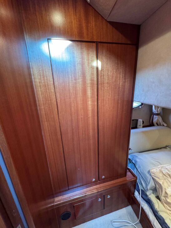 The interior has a luxurious feel with the hi-gloss mahogany woodwork, alcantara panelling, stainless steel work, cream carpets and curtains. This is designed with the “Galley-Up” layout, allowing for the third cabin, giving a single berth or further storage for extra kit.