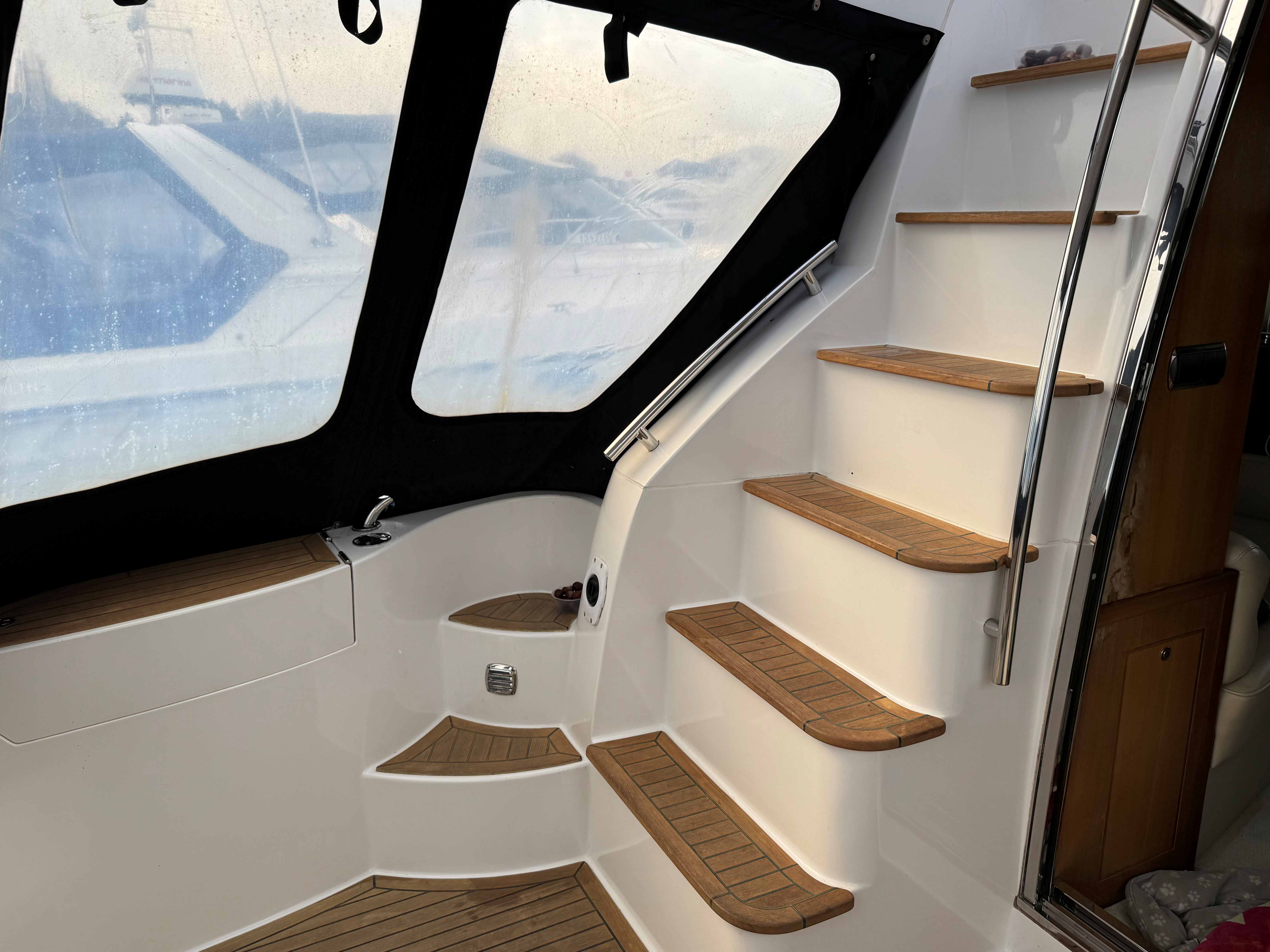 A couple of steps lead up to the galley on the portside and the internal helm station opposite