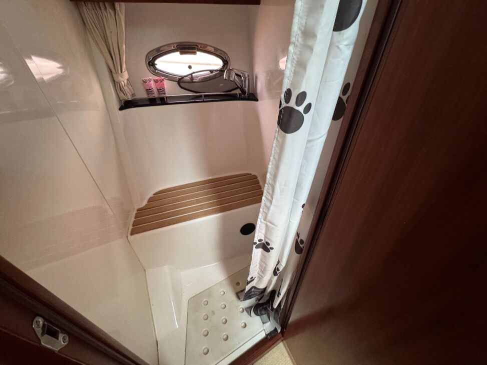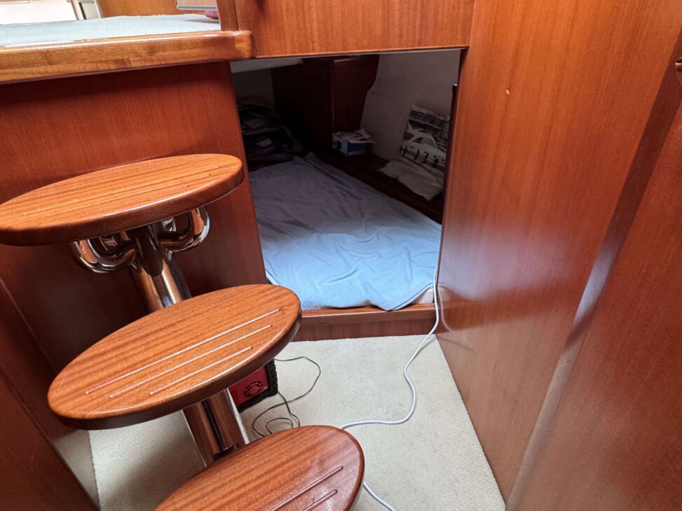 Internally it is a very comfortable layout, fitted to a high standard, offering an open plan saloon and galley, two private cabins, separate heads and shower room and an extra large single berth.