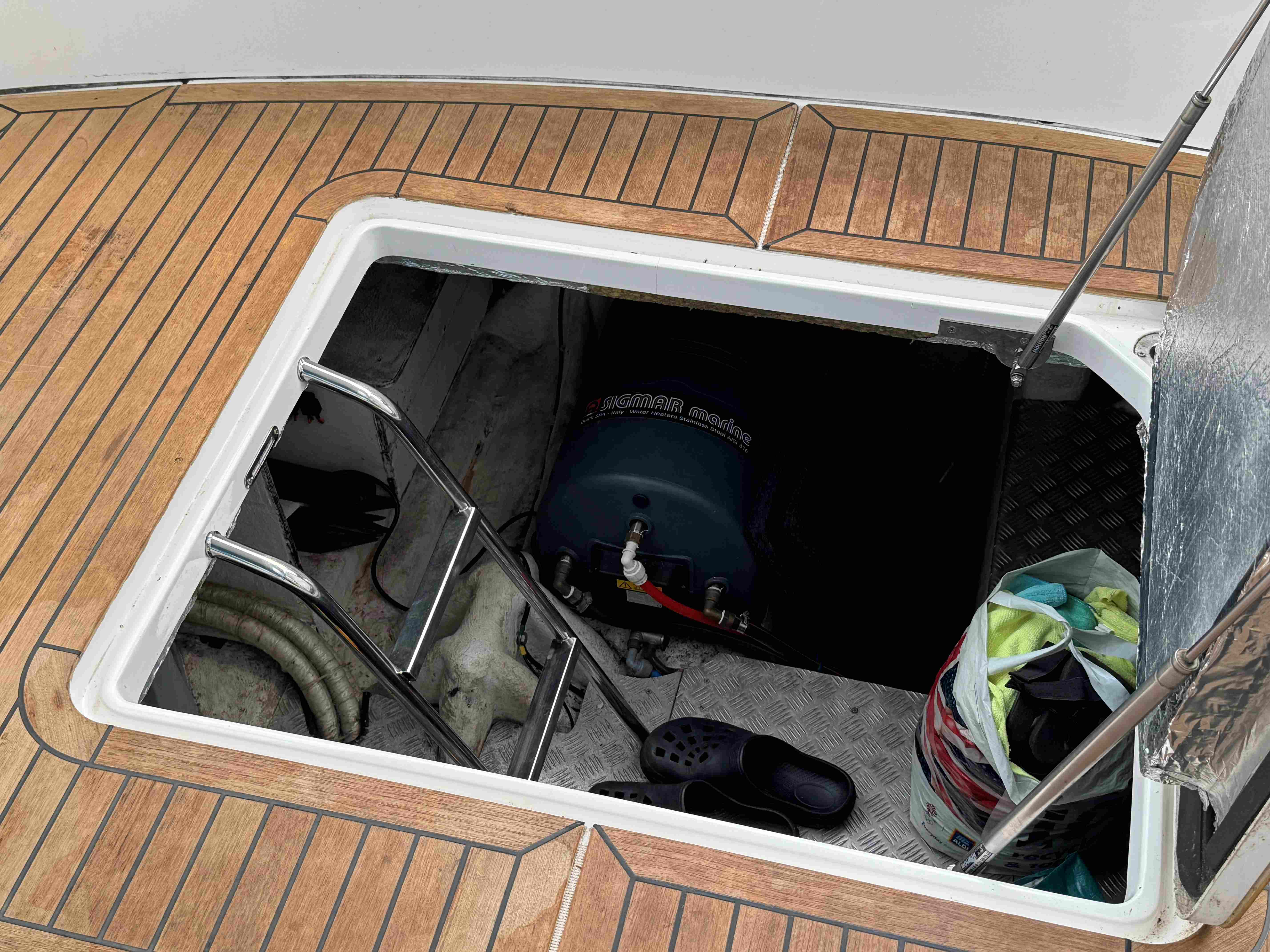 Stepping down into the forward area of the boat:-
