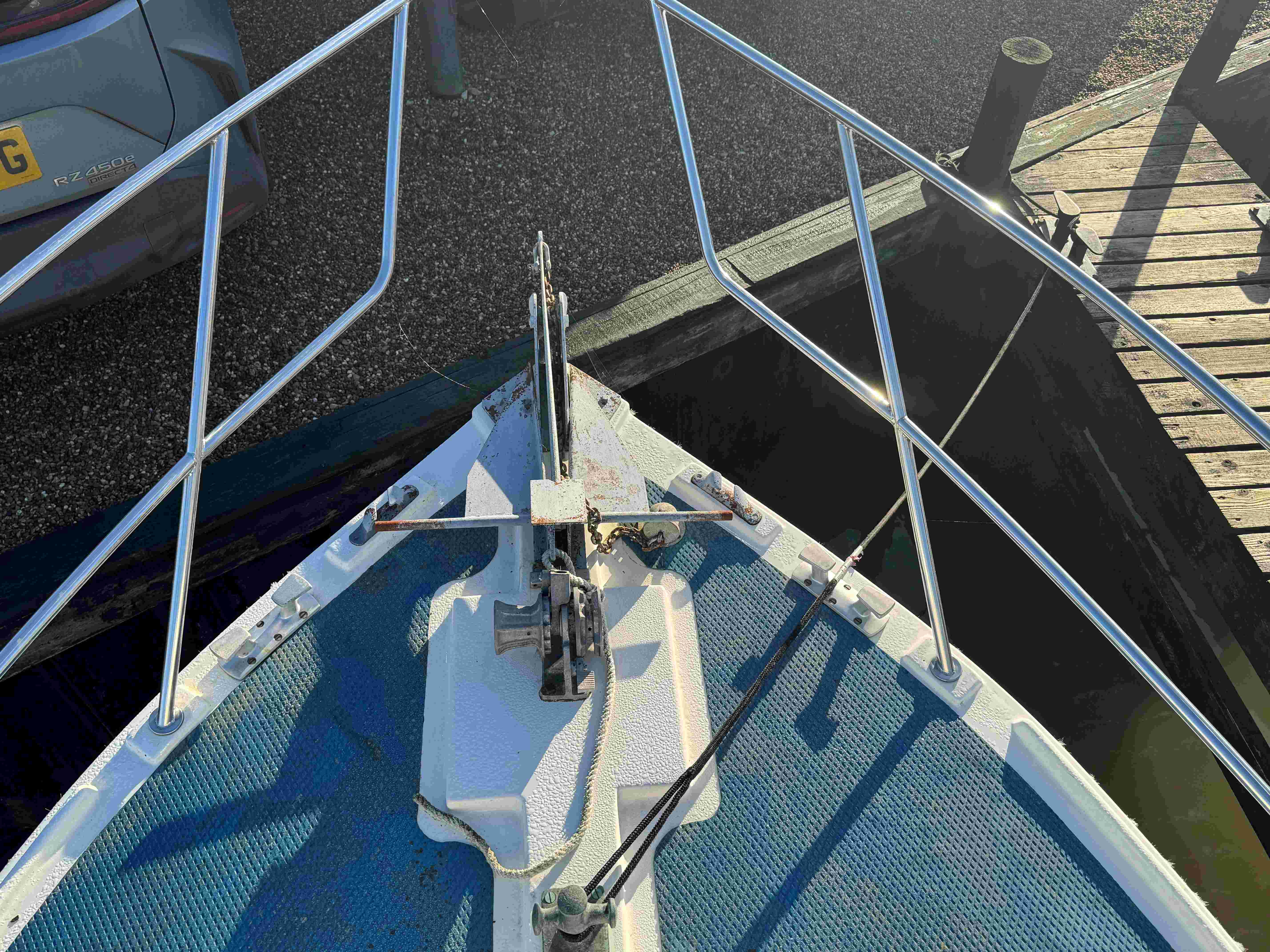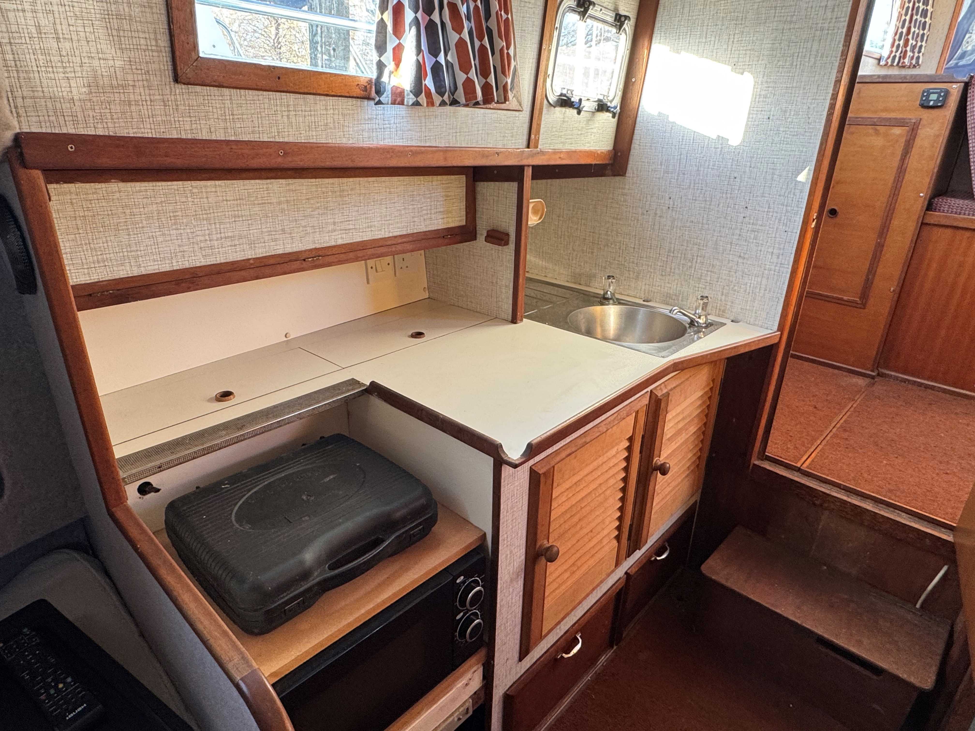 Steps down into the forward cabin comprising